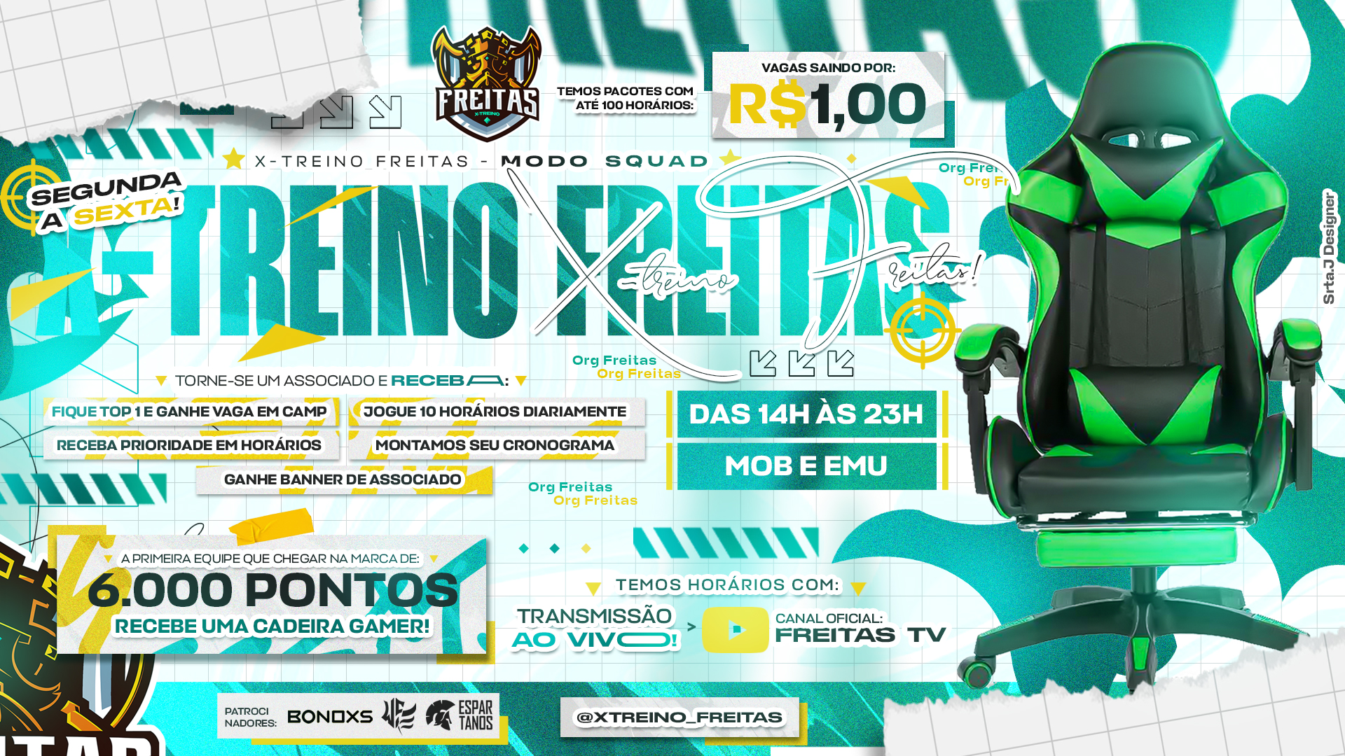 X Treinos Freitas acontecem de segunda a sexta, das 14h às 23h (horário de Brasília). Vagas limitadas por horário.